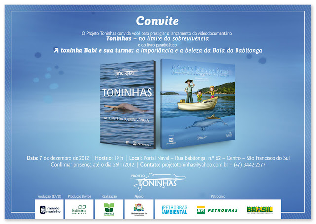 A equipe do Projeto Toninhas lança na próxima sexta-feira (dia 7 de dezembro), às 19 hs, no Portal Naval de São Francisco do Sul, o videodocumentário “Toninhas: no limite da sobrevivência” e o livro paradidático “A toninha Babi e sua turma: a importância e a beleza da Baía da Babitonga”. O Projeto Toninhas, patrocinado pela Petrobras, através do Programa Petrobras Ambiental, desenvolve ações de pesquisa e educação ambiental para a conservação do golfinho mais ameaçado de todo o Atlântico Sul. Durante a solenidade de lançamento, será realizada a primeira exibição do filme.
